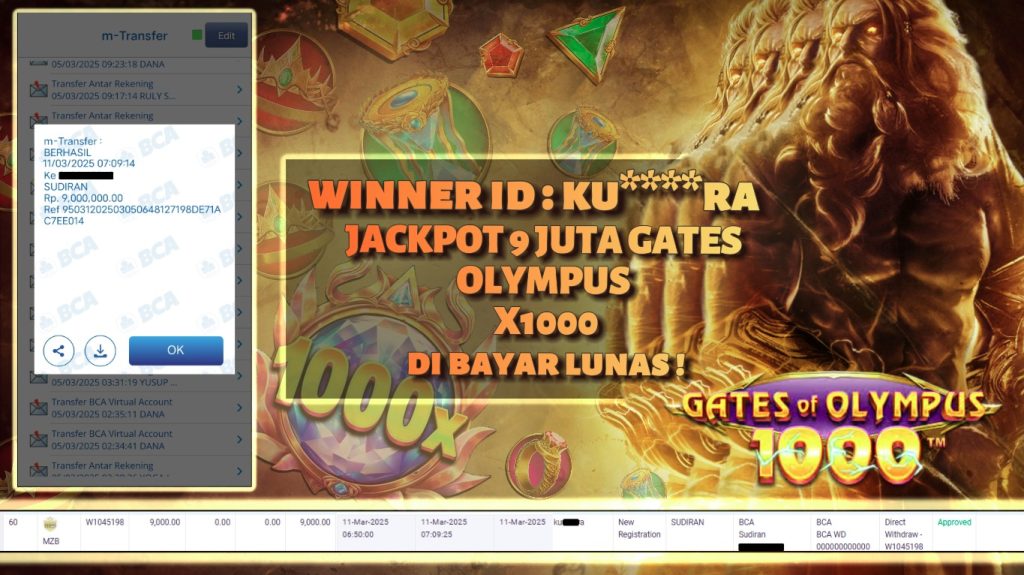 Bukti Kemenangan Dan Withdraw 11 Maret 2025 Di Gates Of Olympus X1000 WD 9 Juta