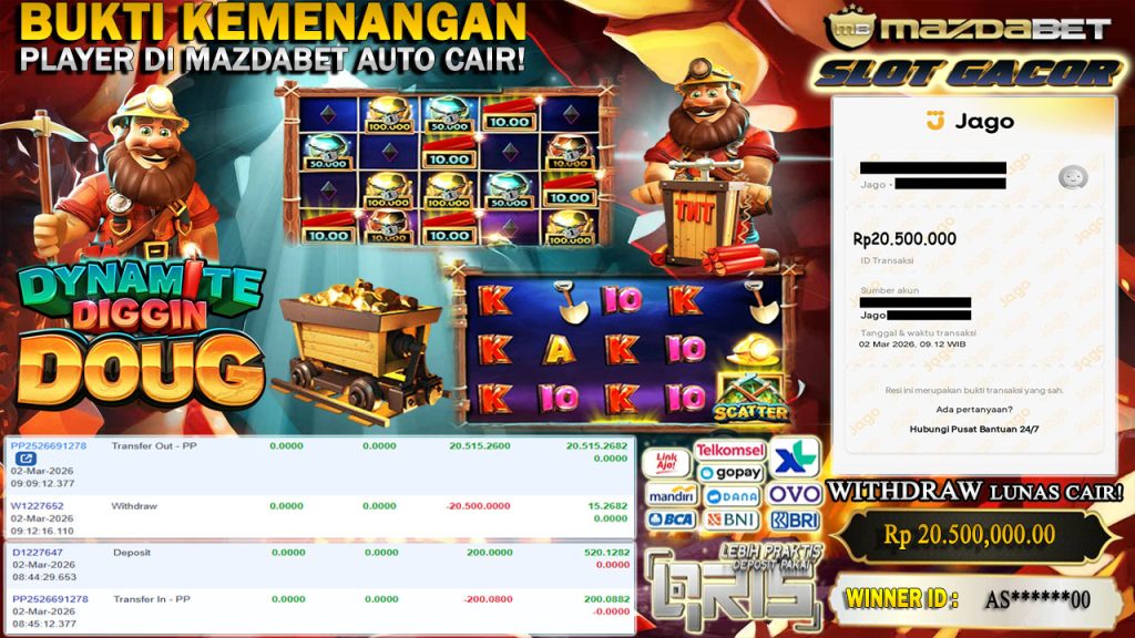 BUKTI KEMENANGAN DAN WITHDRAW 02 MARET 2026 Di Game Dynamite Diggin Doug WD 20.5 JUTA