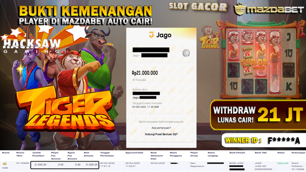 BUKTI KEMENANGAN DAN WITHDRAW 03 Oktober 2025 Di Game TIGER LEGENDS WD 21 JUTA