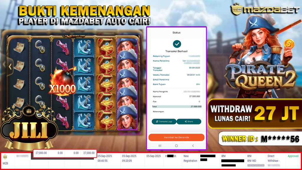 Bukti Kemenangan Dan Withdraw 05 September 2025 Di Game Pirate Queen 2 WD 27 JUTA