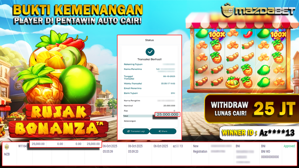 BUKTI KEMENANGAN DAN WITHDRAW 06 Oktober 2025 Di Game Rujak Bonanza WD 25 JUTA