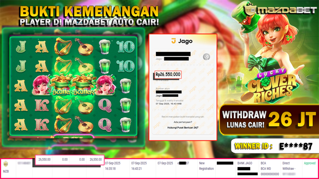 Bukti Kemenangan Dan Withdraw 07 September 2025 Di Game Lucky Clover Riches WD 26 JUTA