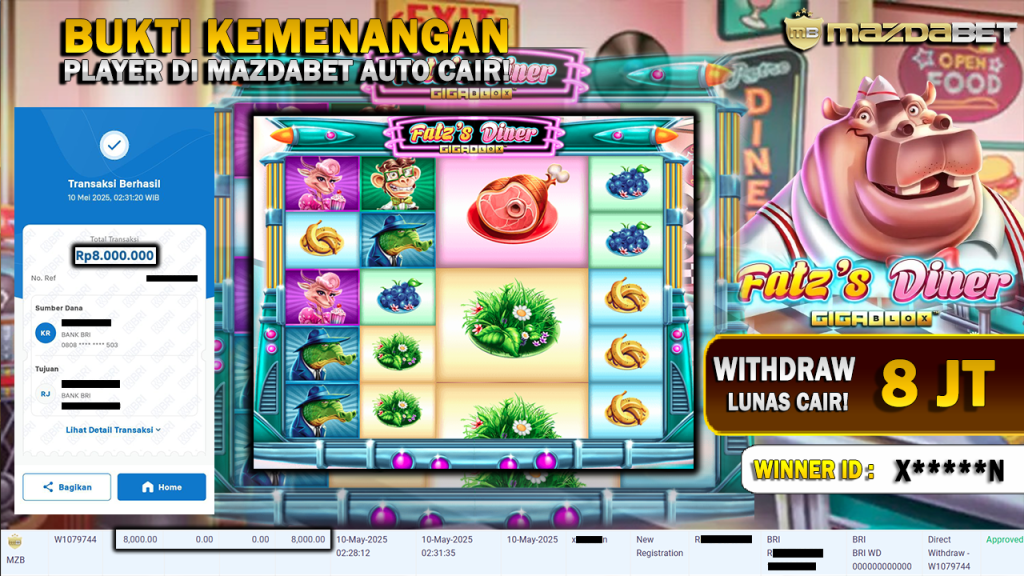 Bukti Kemenangan Dan Withdraw 10 MEI 2025 Di Game Fatz’s Diner WD 8 Juta