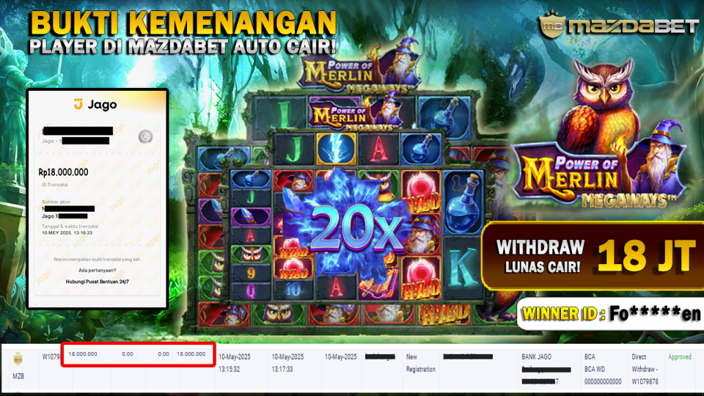Bukti Kemenangan Dan Withdraw 10 MEI 2025 Di Game Power of Merlin Megaways WD 18 Juta