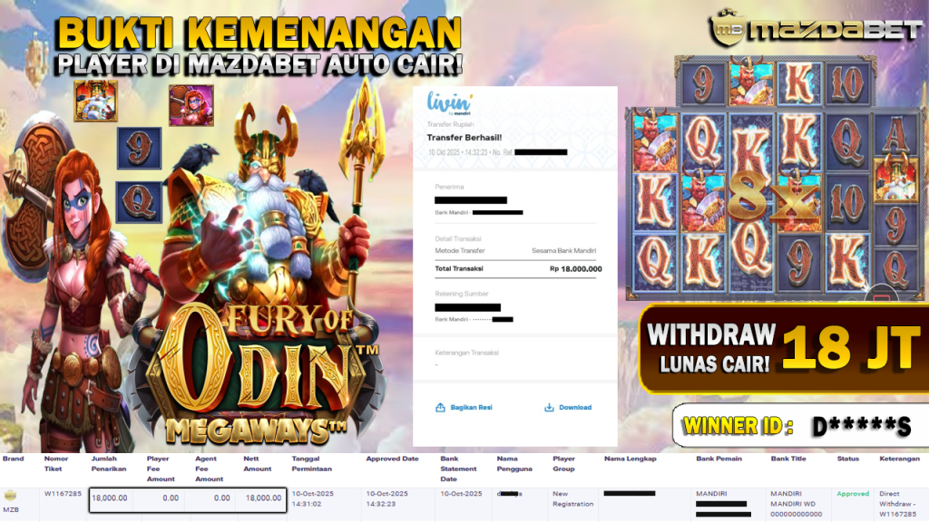 BUKTI KEMENANGAN DAN WITHDRAW 10 Oktober 2025 Di Game Fury of Odin Megaways WD 18 JUTA