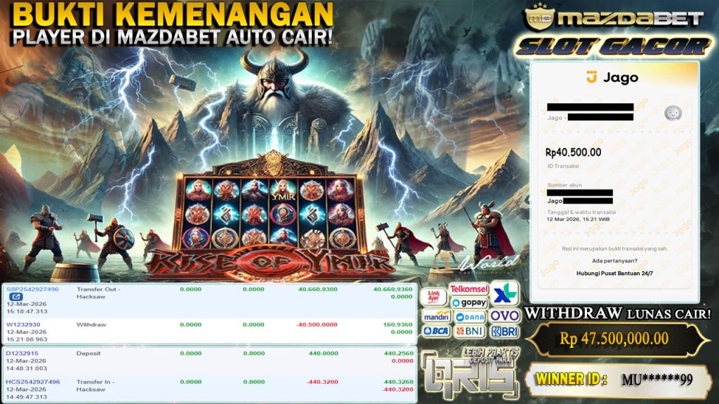BUKTI KEMENANGAN DAN WITHDRAW 12 MARET 2026 Di Game Rise of Ymir ( Hacksaw ) WD 40.5 JUTA