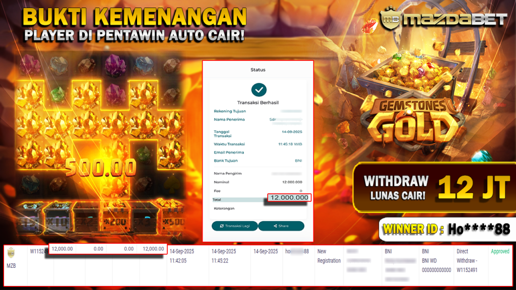Bukti Kemenangan Dan Withdraw 14 September 2025 Di Game Gemstones Gold WD 12 Juta