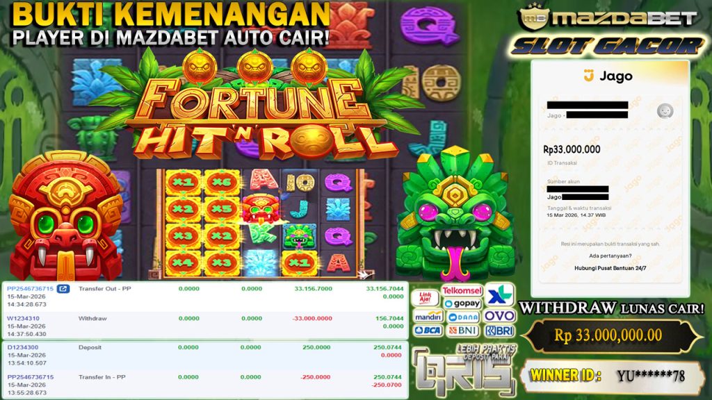BUKTI KEMENANGAN DAN WITHDRAW 15 MARET 2026 Di Game Fortune Hit’n Roll ( Pragmatic Play ) WD 33 JUTA