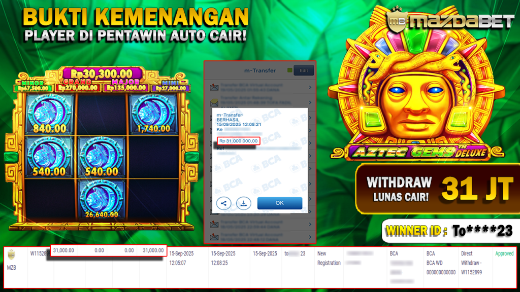 Bukti Kemenangan Dan Withdraw 15 September 2025 Di Game Aztec Gems Deluxe WD 31 Juta