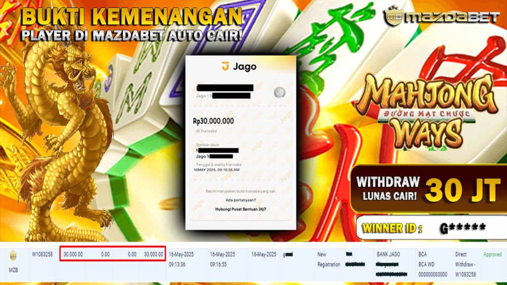 Bukti Kemenangan Dan Withdraw 16 MEI 2025 Di Game Mahjong Ways WD 30 Juta