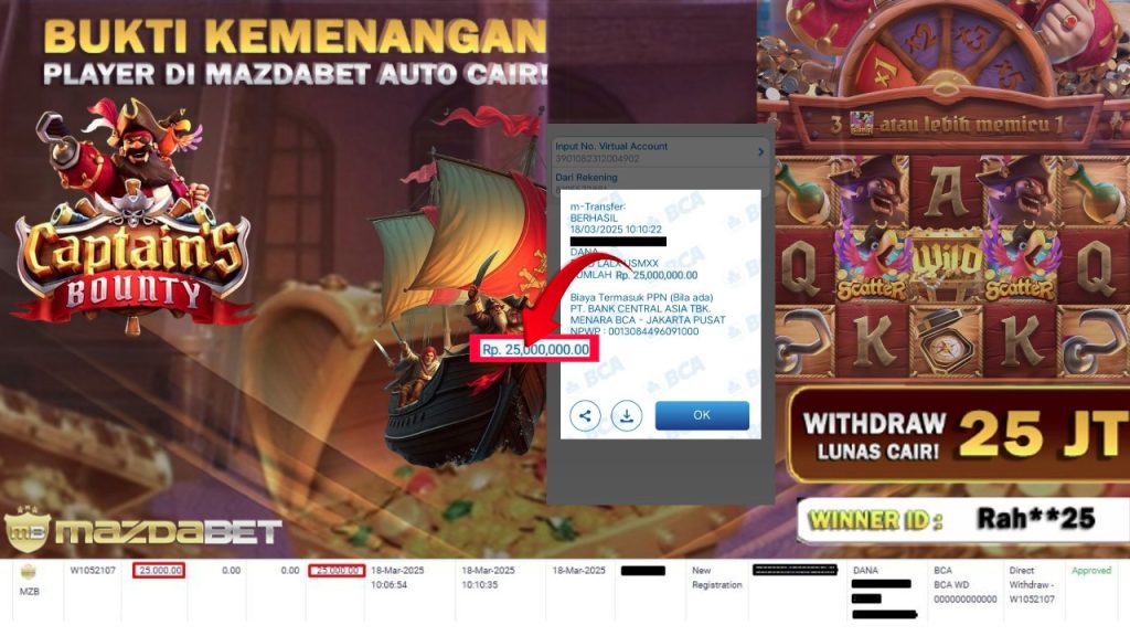 Bukti Kemenangan Dan Withdraw 18 Maret 2025 Di Game Captain’s Bounty PG Soft WD 25 Juta