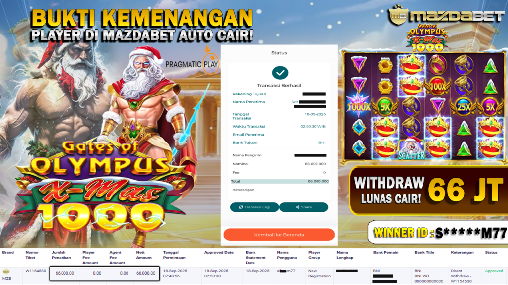 Bukti Kemenangan Dan Withdraw 18 September 2025 Di Game Gates of Olympus Xmas 1000 WD 66 Juta
