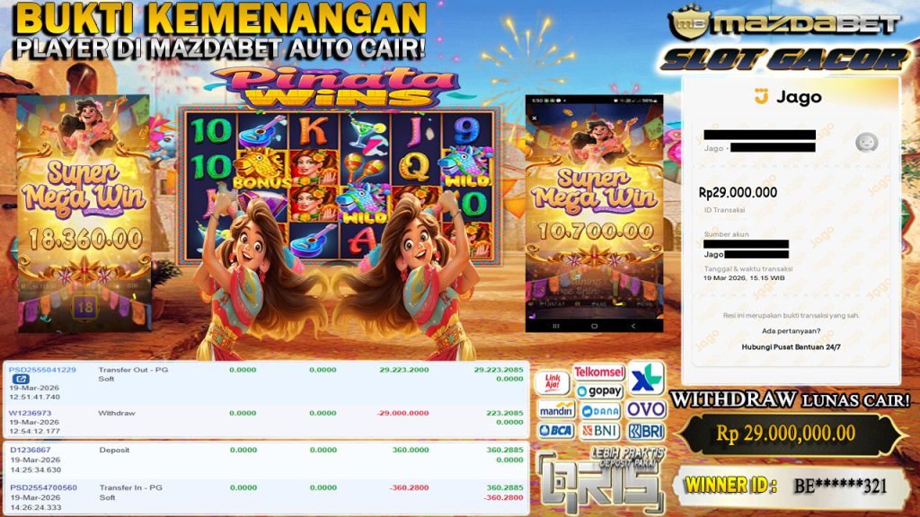 BUKTI KEMENANGAN DAN WITHDRAW 19 MARET 2026 Di Game Pinata Wins ( Pg Soft ) WD 29 JUTA