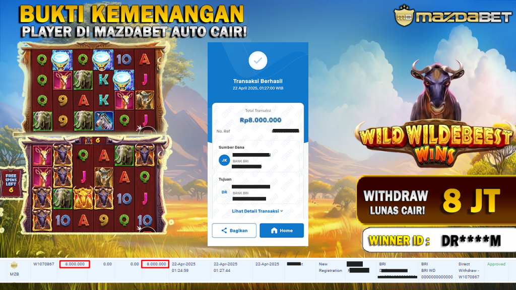 Bukti Kemenangan Dan Withdraw 22 April 2025 Di Game Wild Wildebeest Wins PRAGMATIC PLAY WD 8 Juta