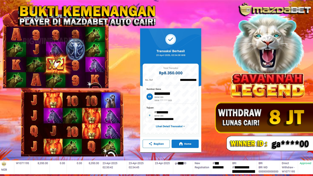 Bukti Kemenangan Dan Withdraw 23 April 2025 Di Game Savannah Legend WD 8 Juta