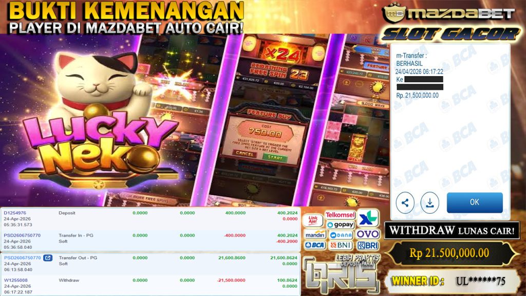 BUKTI KEMENANGAN DAN WITHDRAW 24 APRIL 2026 Di GAME Lucky Neko ( PG Soft ) WD 21.5 JUTA