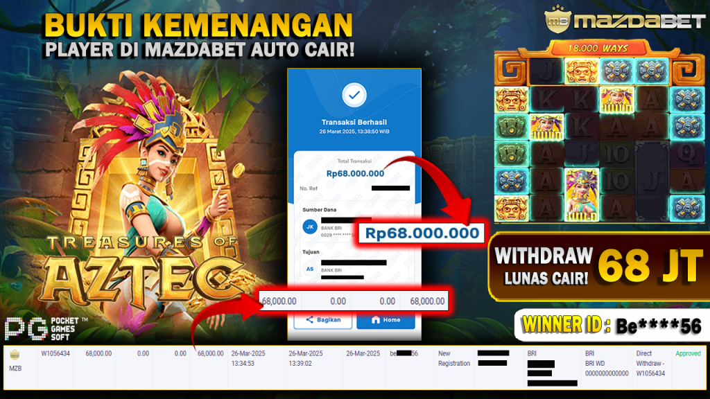 Bukti Kemenangan Dan Withdraw 26 Maret 2025 Di Game Treasures Of Aztec PG Soft WD 68 Juta