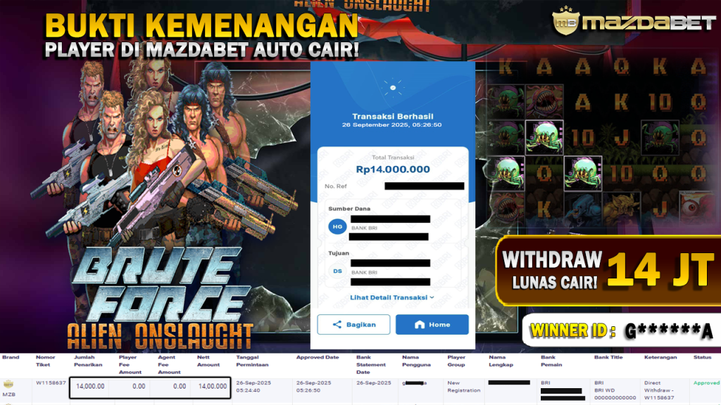 Bukti Kemenangan Dan Withdraw 26 September 2025 Di Game Brute Force: Alien Onslaught WD 14 Juta