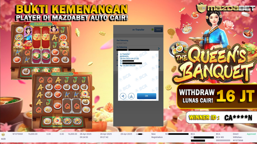 Bukti Kemenangan Dan Withdraw 28 April 2025 Di Game The Queen’s Banquet WD 16 Juta