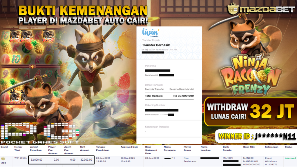 BUKTI KEMENANGAN DAN WITHDRAW 28 SEPTEMBER 2025 DI GAME Ninja Raccoon Frenzy WD 32 JUTA