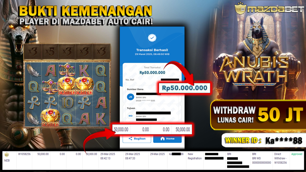 Bukti Kemenangan Dan Withdraw 29 Maret 2025 Di Game Anubis Wrath PG Soft WD 50 Juta