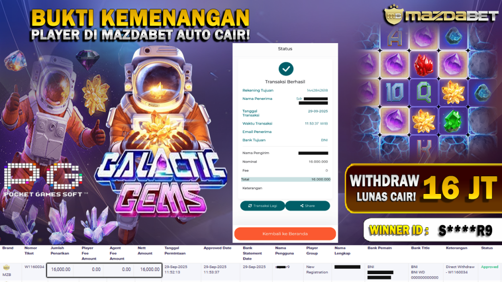 BUKTI KEMENANGAN DAN WITHDRAW 29 SEPTEMBER 2025 DI GAME Galactic Gems WD 16 JUTA