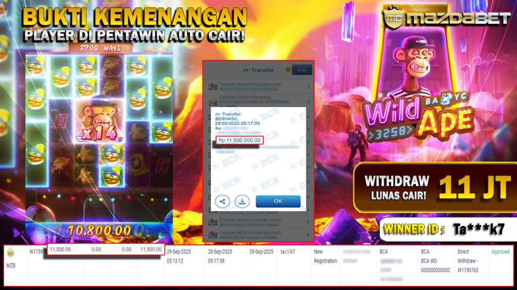 BUKTI KEMENANGAN DAN WITHDRAW 29 SEPTEMBER 2025 DI GAME Wild Ape #3258 WD 11 JUTA