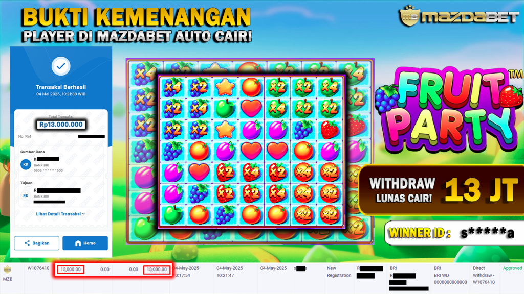 Bukti Kemenangan Dan Withdraw 4 MEI 2025 Di Game Fruit Party WD 13 Juta